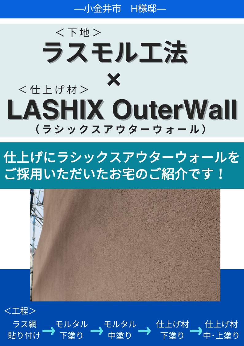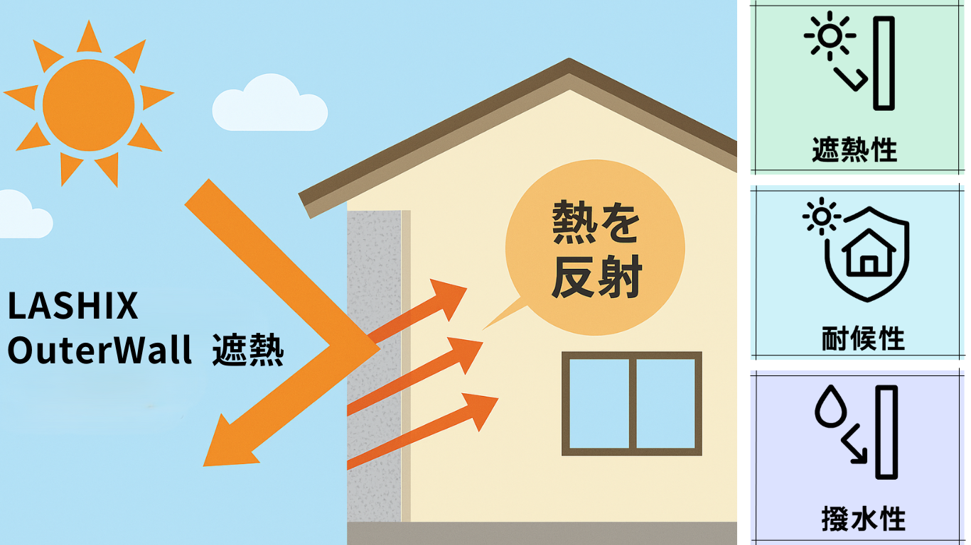 強い日差しによる外壁の蓄熱を抑え、室内の暑さをやわらげる遮熱塗り壁材「遮熱ラシックスアウターウォール」。濃色外壁でも輻射熱を反射し、快適性とデザイン性、省エネ性を同時に叶えます。