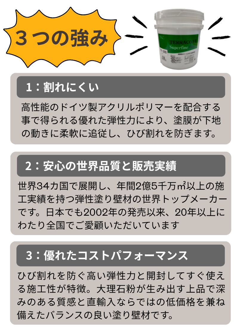 - 内外装兼用 塗り壁仕上げ材『テラコートスーパーファイン』のご案内です