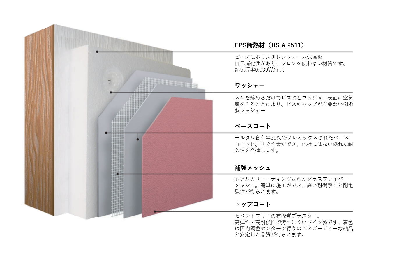 複合断熱システム(湿式外断熱工法)を1964年に世界で初めて開発し、以降業界のトップシェアを誇ります。